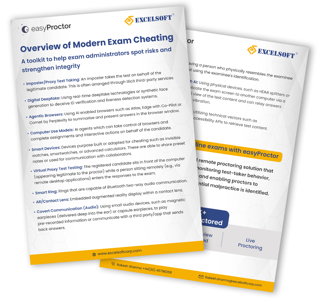 Evolving cheating methods are reshaping how exams are safeguarded and monitored. Stay ahead with Excelsoft’s quick guide — a concise, practical overview of today’s most common and emerging test-fraud tactics.